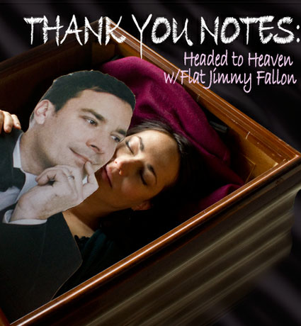 “Vicki Vodrey’s THANK YOU NOTES: Headed to Heaven with Flat Jimmy Fallon is one of those off-Broadway surprises that make the search for good theatre worthwhile and so exciting. Take a totally off-the-wall concept executed by lovable but slightly bizarre characters, pepper it with lots of humor and a pinch of poignancy that packs a powerful punch (try saying that three times fast), and you end up with a breath-taking production… Vodrey’s honesty and courage in presenting a unique relationship is so effective and admirable that you will want to send her a thank you note. You shouldn’t miss this 60-minute funeral – THANK YOU NOTES is heavenly!”